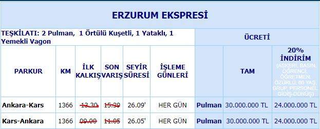 İlk seferlerine Erzurum Ankara arasında başlayan Erzurum Ekspresi 20 Haziran 2003 tarihinden itibaren Ankara Kars arasında çalışmaya başlamıştır. Tren o günlerdeki süper ekspres kategorisinde idi. Yine o dönem Doğu Ekspresi İstanbul (Haydarpaşa) Kars arasında çalışmaktaydı. Eruzum Ekspresi ise Ankara Kars güzergahında hizmet veriyordu. Tren numarası 41001 - 21002 olan Erzurum Ekspresi bu güzerahta her gün çalışıyordu. 2004 Yılında Erzurum Ekspresi'nin teşkilatı: 2 Pulman, 1 Örtülü Kuşetli, 1 Yataklı, 1 Yemekli Vagondan oluşmaktaydı. Ankara Kars arası o günkü parkur uzunluğu 1366 km idi. 2004 Yılında Ankara Kars tren bileti fiyatları ise aşağıdaki tablodaki gibiydi. Tam bilet 30 000 000.- TL (Otuz milyon Türk Lirası), yine aşağıda 2003 yılı yemekli vagon fiyat listesi yer almaktadır. Günümüzde bu hatta Doğu Ekspresi ve Turisik Doğu Ekspresi hizmet vermektedir. Erzurum Ekspresi Süper Ekspres kategorisinde (Kaynak: TCDD) olup, Süper Ekspresler hızlı ve konforlu olup, büyük kentler arasında işleyen ara gar ve istasyonlarda durdurulmayan trenlerdir.